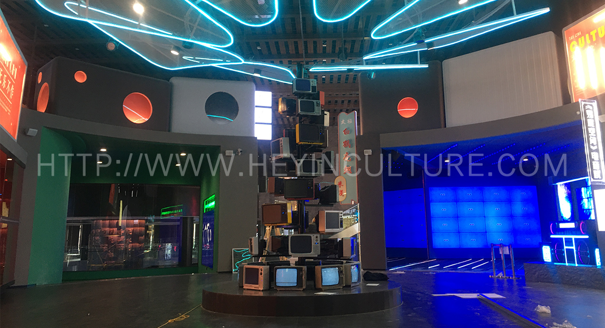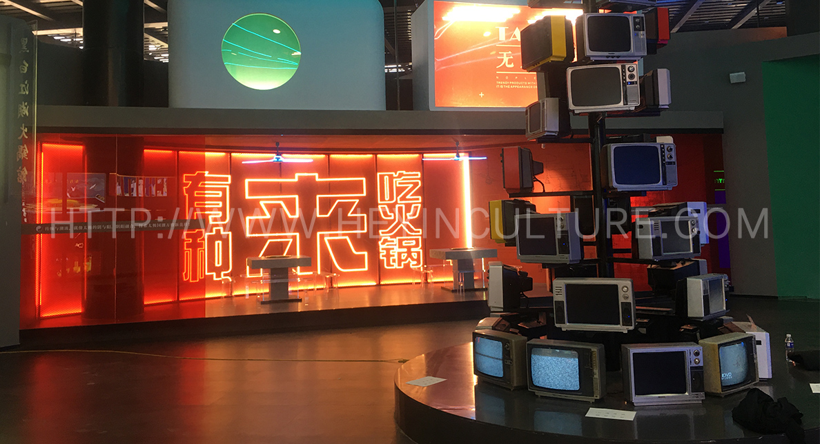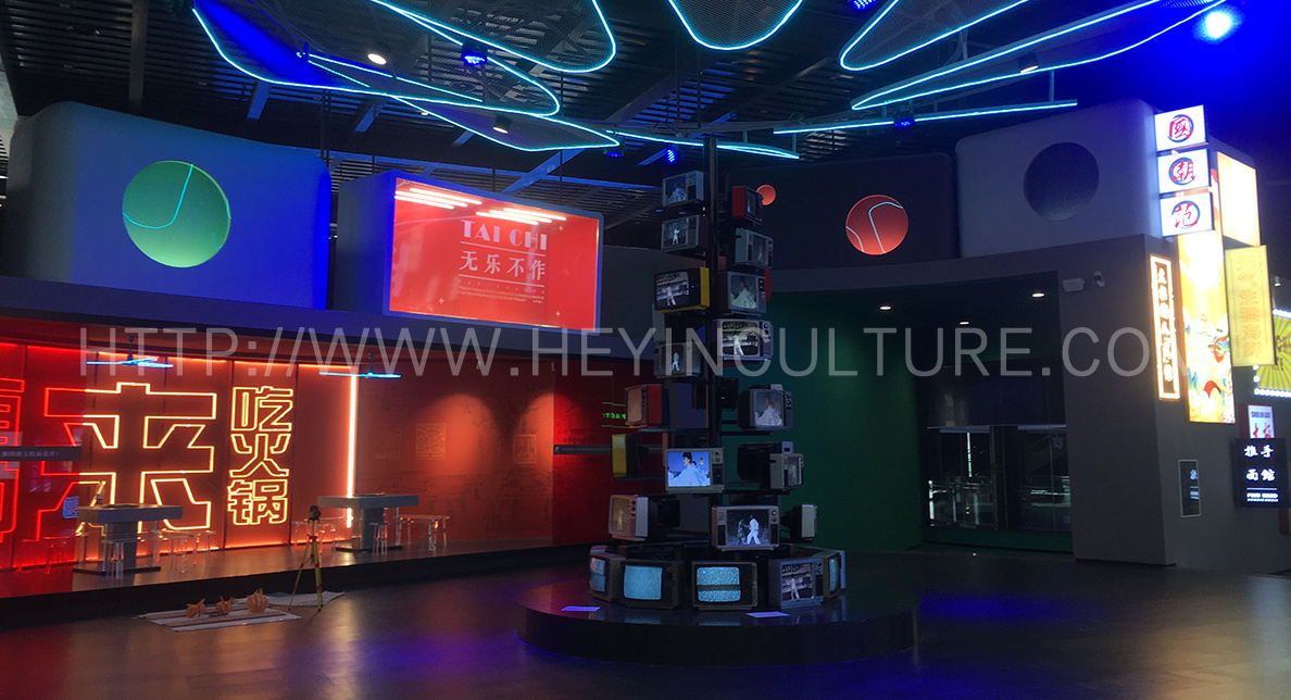 將太極文化與年輕人喜愛的潮流文化進(jìn)行跨界融合,探索太極文化在時尚消費、電子音樂、流行舞蹈、美食餐飲、動漫文化、潮流美 妝等領(lǐng)域的擴張邊界,在實驗中孕育新的太極文化消費趨勢,綜合打造一個好看、好玩、好有趣的潮流文化體驗與社交街區(qū)。街道招牌與分展區(qū) 的命名在包含太極韻味的同時兼具趣味性,黑白江湖老火鍋、太極 Dance Studio、“極致”美研所、“易度空間”電音趴、自然雜貨鋪、動慢 面館、Tai Chi EDM Club、精氣神潮貨鋪、國潮動漫屋,刮起國潮新風(fēng)向。