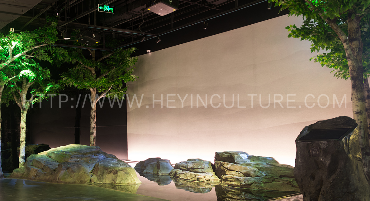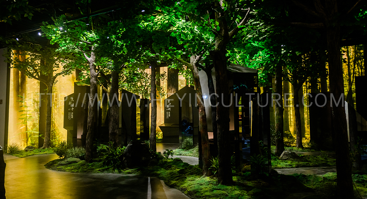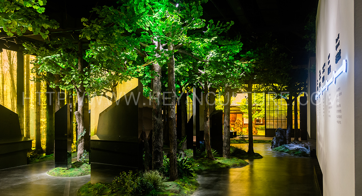 提煉陳家溝東溝的草地、樹木、晨霧等空間元素,運用在該展區(qū)的空間設(shè)計之中,并將展示設(shè)備巧妙融入樹林里、叢林中,打造 一個走進(jìn)東溝看故事的沉浸體驗空間,為游客提供身臨其境的參觀感受。