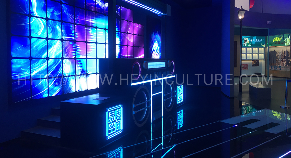 “易度空間”電音趴是一個太極主題的EDM Club,設(shè)計地面鋼琴鍵的踩踏互動裝置,內(nèi)置不同音色、不同旋律的采樣loop,多人在 上面跳舞,就可以演奏一首好聽的太極國風(fēng)電音舞曲。同時,設(shè)計電音DIY的DJ臺,游客在觸控屏幕上通過拖、拉旋律,就可拼接創(chuàng)作出好聽的 EDM。