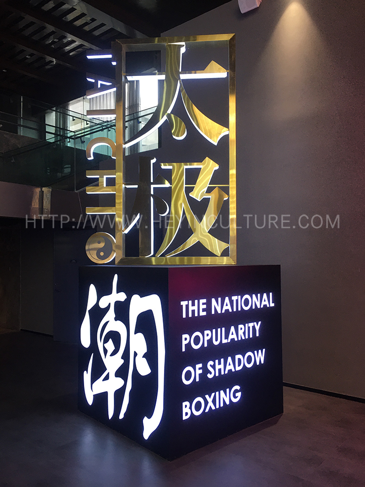 瀏覽完陳鑫《陳式太極拳圖說》空間,就會經(jīng)過三重門,。門匾上寫著“神明”,兩邊工整對聯(lián)“惟有五陰并五陽”、“陰陽無偏稱 妙手”。游客通過了三重門,便意味著進(jìn)入了“神明”的境界,會有兩條太極魚游動的畫面。通過三重門,便來到太極拳考核區(qū)域。該區(qū)域用體 感系統(tǒng)考核簡化版陳式太極拳18式。通過考核后,中央扶梯上的影像系統(tǒng)會呈現(xiàn)太極魚躍龍門的畫面,象征著游客此時優(yōu)秀的太極拳水平。
