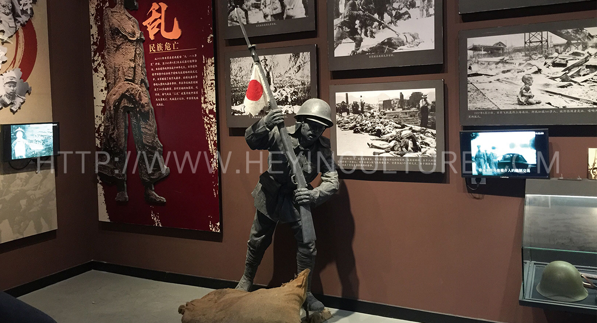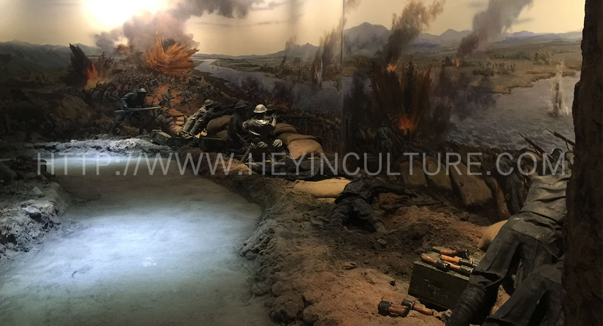 設(shè)計(jì)說明:破碎的城池,四起的硝煙,堆積如山的尸體,體現(xiàn)了戰(zhàn)爭(zhēng)之慘烈,日軍之兇殘,我軍之英勇,正可謂一寸山河,一寸血,觀眾的參展路線貫穿整個(gè)藝術(shù)場(chǎng)景,現(xiàn)場(chǎng)戰(zhàn)爭(zhēng)氣氛的強(qiáng)烈代入感,可讓參觀者切身體驗(yàn)戰(zhàn)爭(zhēng)之殘酷,革命之艱辛。